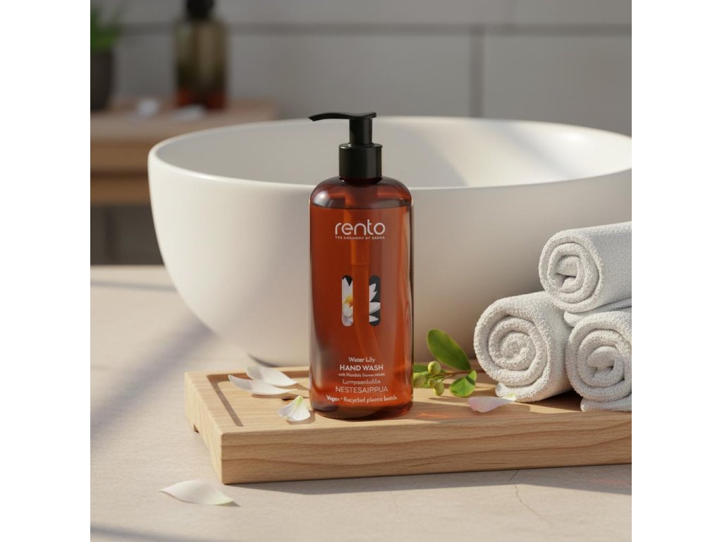 Tekuté mýdlo na ruce s vůní leknínu jemně čistí a pomáhá udržet pokožku rukou hebkou. Vhodné pro časté mytí v koupelně i u sauny.
